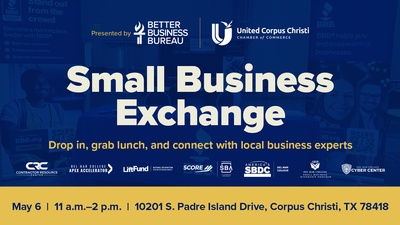 Join us for the Small Business Exchange on Wednesday, May 6 from 11 a.m. to 2 p.m. at the Coastal Bend Business Innovation Center, hosted in partnership with the United Corpus Christi Chamber of Commerce in celebration of National Small Business Week.