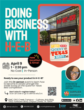 If you are interested in doing business with a company like H-E-B, you won't want to miss this IN-PERSON event. In addition to what it takes to become a vendor, you will learn recent updates about their Quest for Texas Best contest, now entering its 13th year! Applications for Quest for Texas Best opened on March 11th and will close on April 22nd. You do not want to miss this opportunity to learn directly from H-E-B.